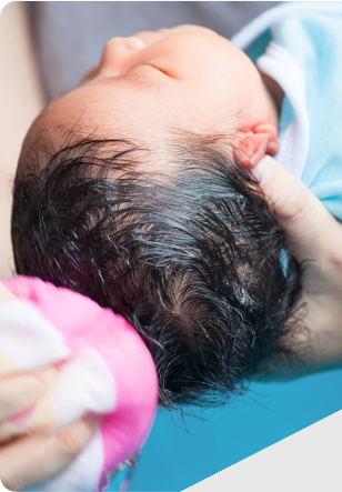 Para que tu bebé se sienta cómodo y seguro envuélvelo en una toalla, coloca el brazo por debajo de la espalda del bebé y coloca tu mano detrás de su cabeza. Con la otra mano humedece su pelo. Aplica una pequeña cantidad de JOHNSON’S® Baby Shampoo y distribúyelo con suaves masajes por toda la cabeza. La cabeza del bebé tiene una zona blanda (llamada fontanela) donde el cráneo no se ha cerrado por completo. Esta parte blanda permite que el cráneo se amolde al pasar por el canal de parto al nacer. Toca y enjuaga esta zona con mucho cuidado. Enjuaga el pelo del bebé con agua hasta quitar todo el producto.